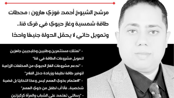 مرشح الشيوخ أحمد فوزي هارون : محطات طاقة شمسية وغاز حيوي في قرى قنا.. وتمويل ذاتي لا يحمّل الدولة جنيهًا واحدًا